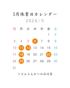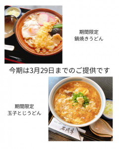 今季の鍋焼きうどん・玉子とじうどんは3月29日日曜日まで 日頃より石川亭をご利用いただきまして誠にありがとうございます。 今季の鍋焼きうどん・玉子とじうどんのご提供は3月29日日曜日までとなります。 ご来店お待ちしております。