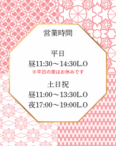 平日11;30~14:30L.O (従来より昼の営業時間が長くなります!)